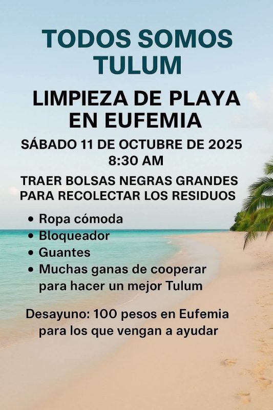 TULUM, Quintana Roo a 20 de Octubre de 2025 .- Mientras empresarios del sector luchan por mantener a flote sus negocios ante la baja afluencia turística, el Club de Playa «Eufemia» parece vivir en su propia burbuja e intenta sacar ventaja con una convocatoria que lanzó para limpiar su playa, pero cobrando 100 pesos a los participantes, supuestamente por el desayuno.